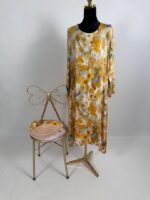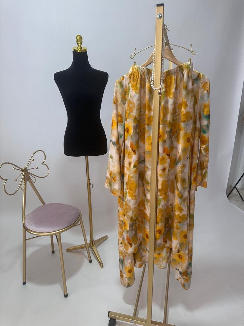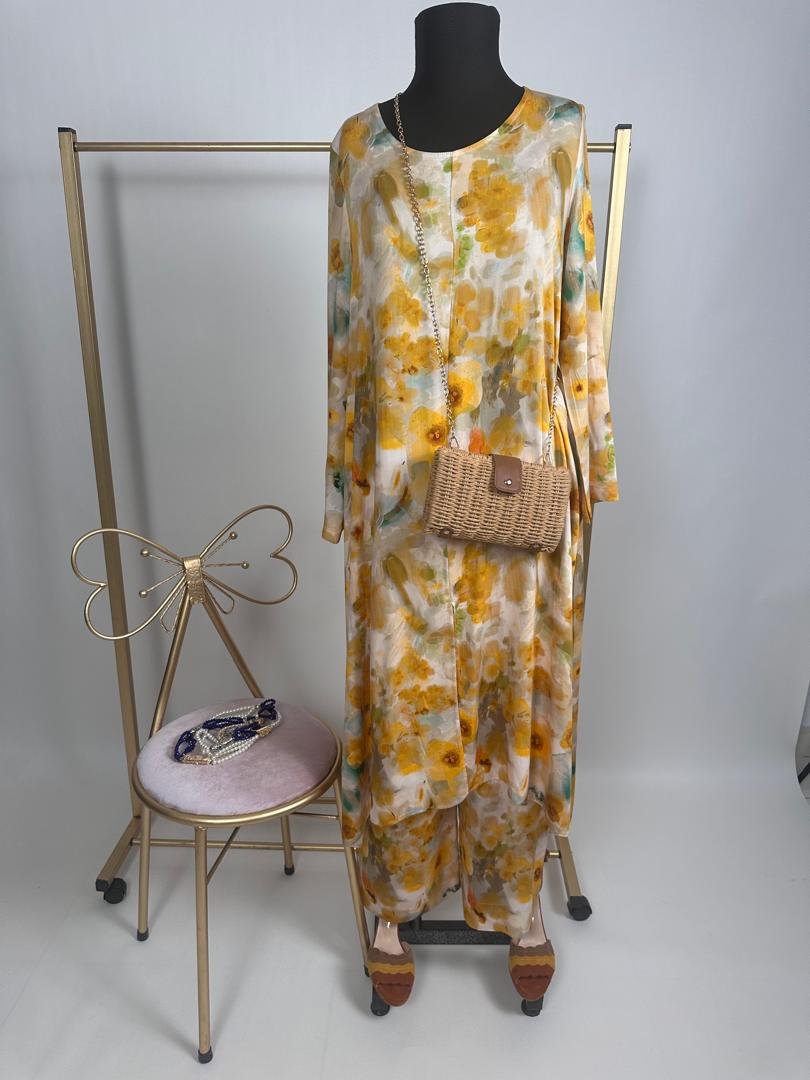 Conçu dans un tissu fibrane léger et respirant, il est orné de délicates fleurs jaunes qui apportent fraîcheur et féminité à chaque mouvement. Sa coupe ample et confortable épouse toutes les morphologies tout en offrant une allure chic et gracieuse.